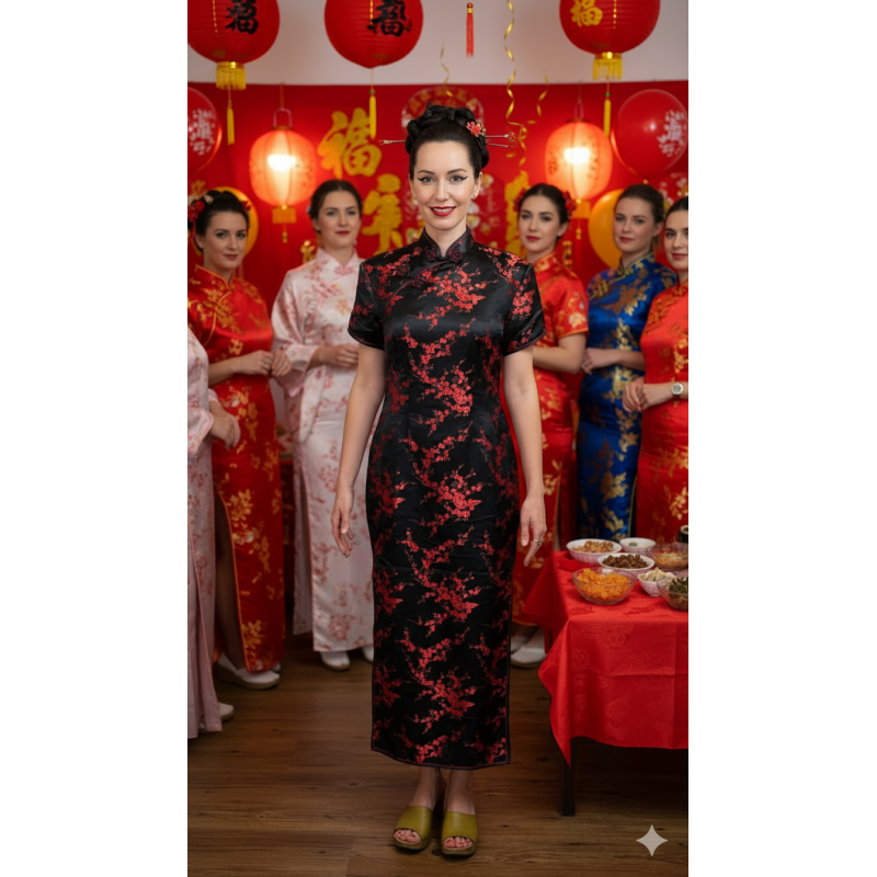 Elegantní dlouhé Qipao v lesklé černé barvě s bohatým vzorem červených květů sakury. Tradiční stojáček, krátké rukávky a boční rozparky dodávají modelu slavnostní a ženský vzhled. Perfektní na čínský Nový rok, gala večírky i tématické kostýmové akce.